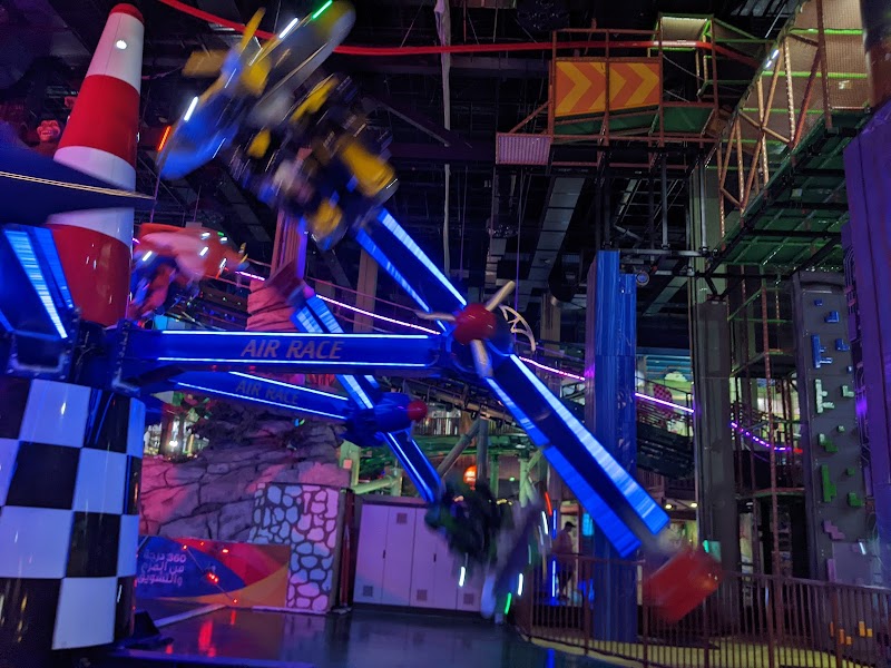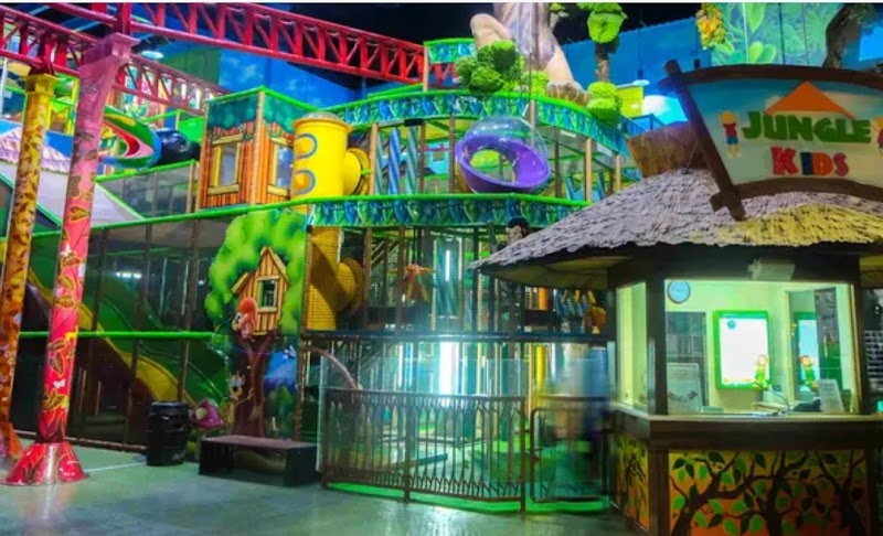 مدينة ملاهي داخلية كبيرة مصمّمة على طراز الغابة تضمّ ألعاب ركوب مثيرة وألعاب ركوب للأطفال وسيارات سباق الملاهي