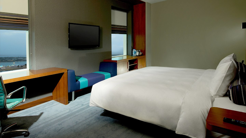 فندق معاصر فيه غرف بسيطة وبار عصري على السطح ومطاعم راقية وحوض سباحة